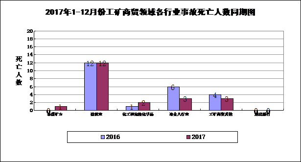 1-12月份,工矿商贸领域事故中的非煤矿山、化工及危险化学品事故死亡人数同比上升。建筑业事故死亡人数同比持平,但占工矿商贸领域比重较大,1-12月份建筑业共死亡12人,事故死亡人数占工矿商贸总死亡人数57.14%。