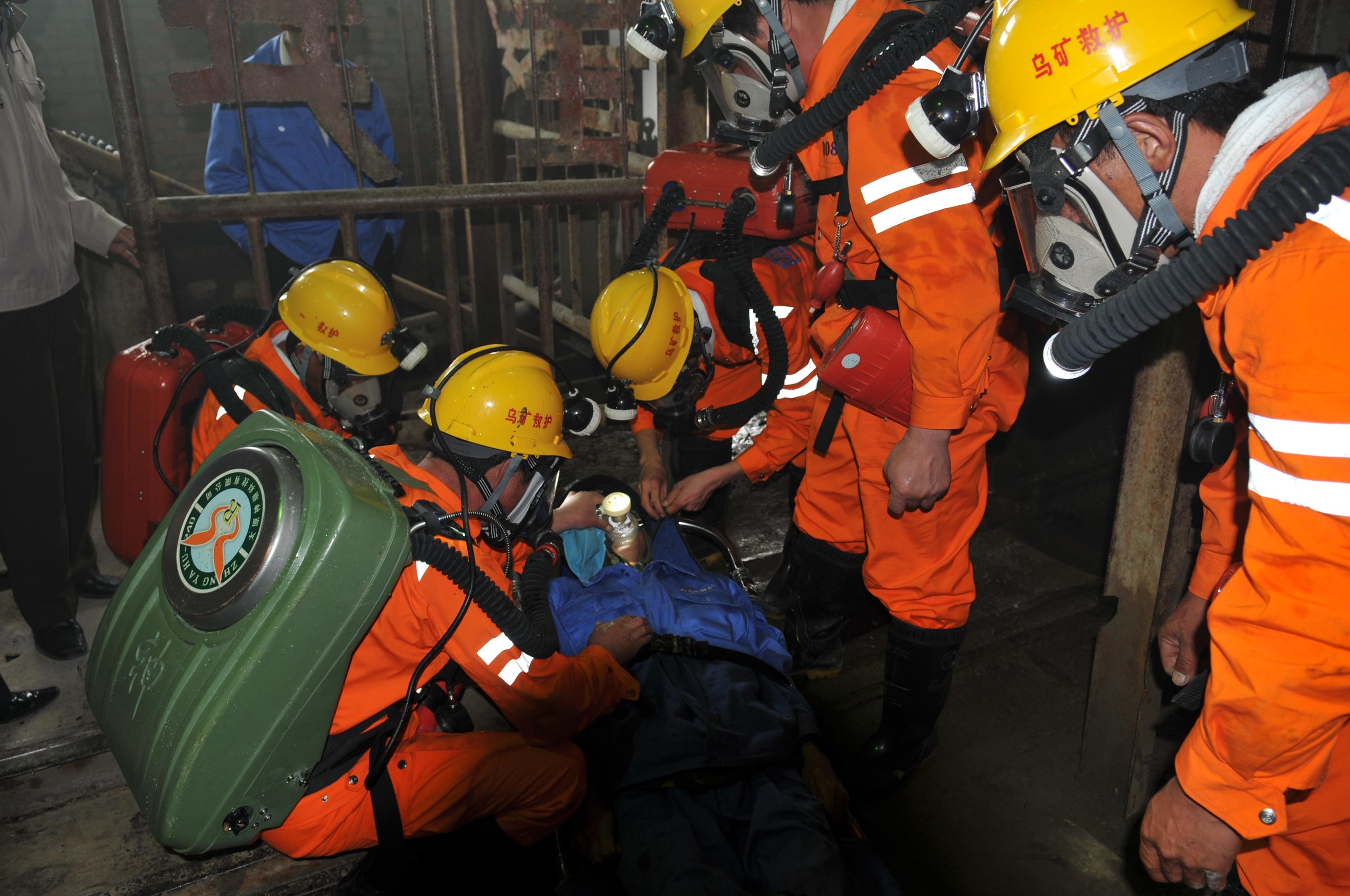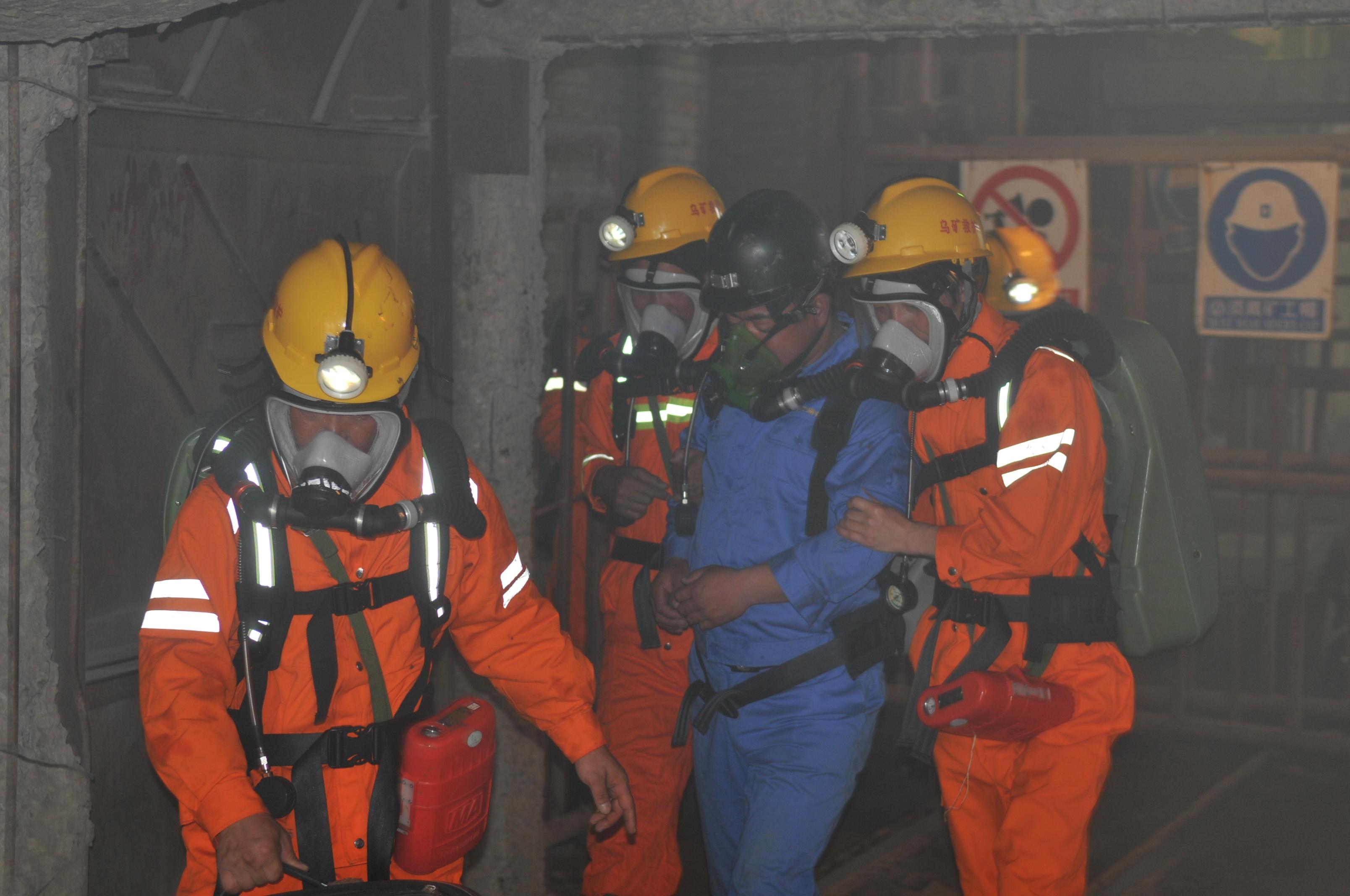 井下小队报告,在事故地点发现两名伤员,对其中一名伤员进行检查后做紧急处理并佩戴全面罩氧气呼吸器